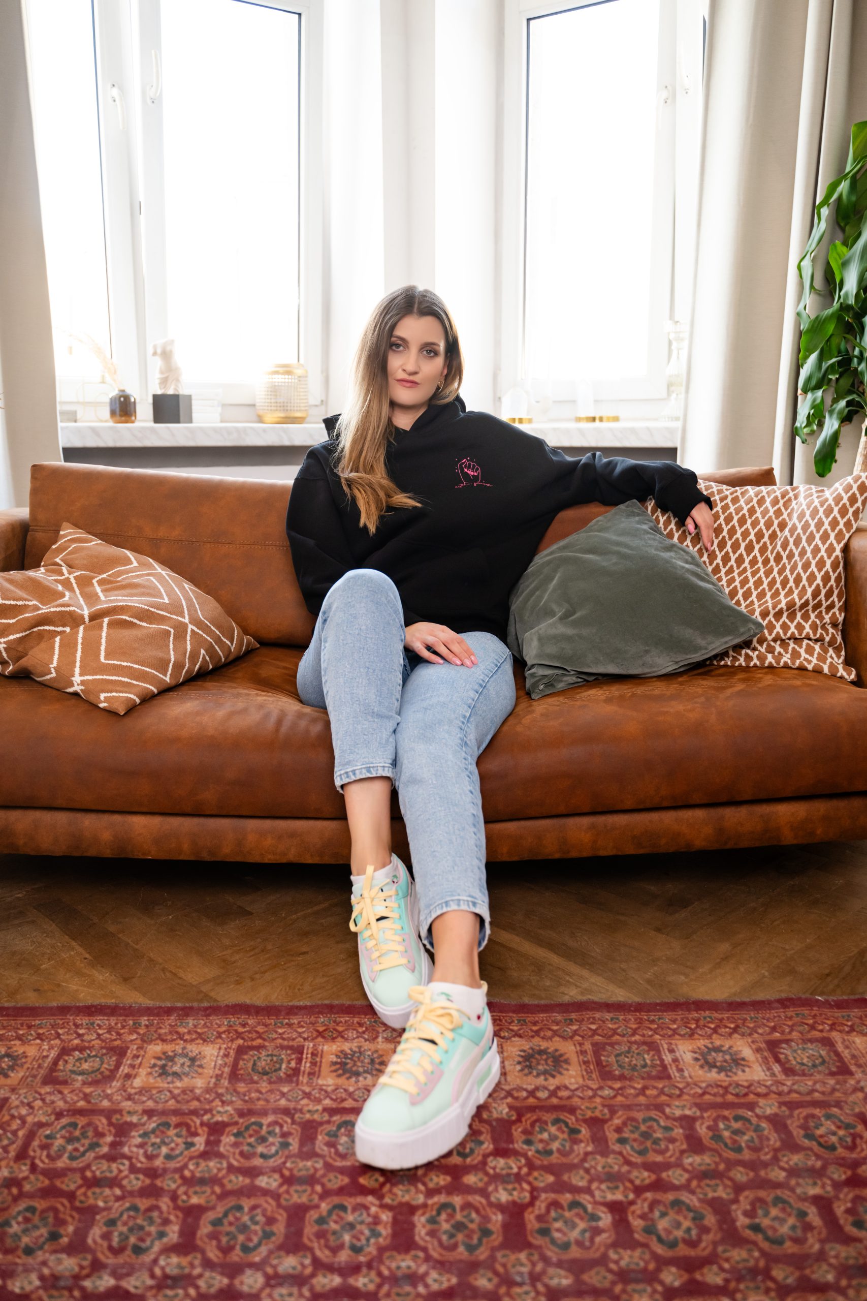 Czarna bluza powstała z najwyższej jakości bawełny drapanej z domieszką włókna poliestrowego, które sprawia, że materiał zachowuje odpowiednią sprężystość.