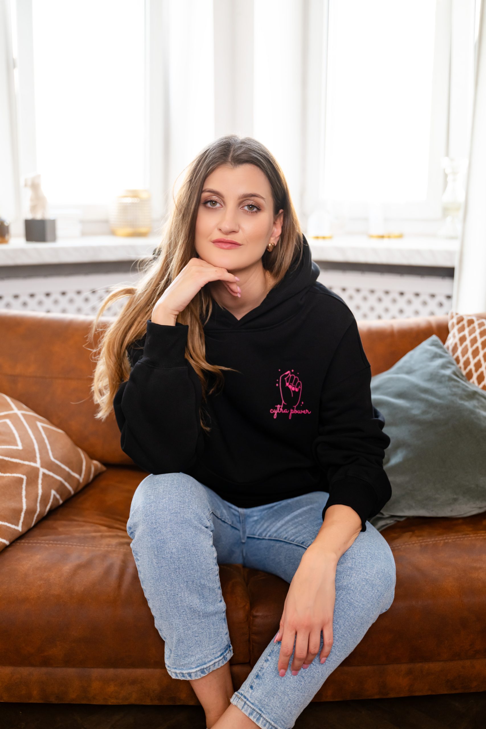 Z przodu nadruk cyfrowy „CYTRA POWER” połączony z grafiką damskiej dłoni złożonej w pięść, która symbolizuje siłę Cytr.
